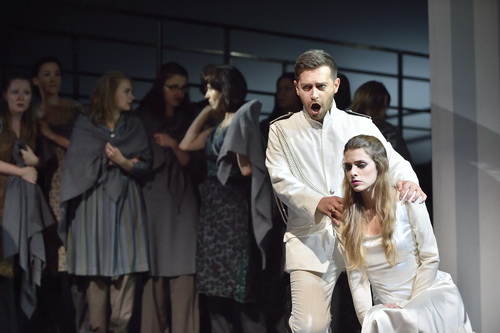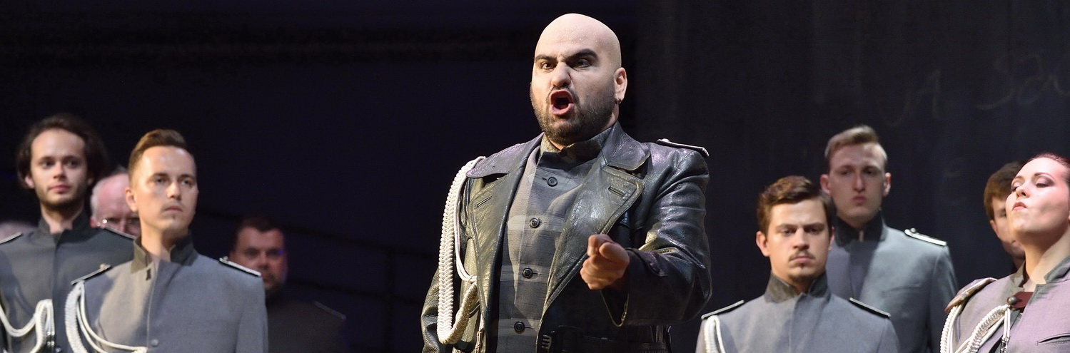 Die für Wildbad gewählte robustere Erstfassung erlaubt Schönleber anders als in der späteren Fassung für Paris, sich voll und ganz auf die Hingabe der Anna zu konzentrieren. Diesem Grundgedanken folgen auch das von ihm erdachte Bühnenbild sowie die Choreografie von Matteo Marziano Graziano, der als Mitarbeiter der Regie zeichnet. Die heroischen Momente, erst recht die orientalischen Attribute sind weitgehend ausgespart. Die Szene wird nicht von Beduinenzelten und Krummschwertern beherrscht. Vielmehr dominieren schwarze Uniformen und martialische Ledermäntel. Die Sänger des Camerata-Bach-Chors Poznan tragen Kapuzen, die eine ganze Reihe von Assoziationen auslösen, jedoch keine bestimmte. Ein langer Steg quert den linken Teil der Bühne und schafft Raum für optisch wirksame Auf- und Abtritte. Zur Mitte hin ist ein Podest platziert, auf dem die Protagonisten im Anschluss an die jeweiligen Rezitative ihre Gefühle darlegen, in der Solo-Arie, im Duett oder gar in großartigen Terzetten, die zu den innovativen musikalischen Elementen dieses Werks gehören. Der rechte Teil der Bühne wird von einer drehbaren Wand mit der Option ausgefüllt, verschiedene Einstellungen zu zeigen. Mal die Andeutung herrschaftlicher Räume, mal das Schlafzimmer der Anna mit einem angedeuteten Schrein zum Gedächtnis an die verstorbene Mutter.