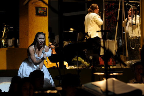 Dabei greift Goebbels ideell mit seiner pessimistischen Darstellung unserer Städtelandschaften kürzer als Wagner, der gleich die ganze Welt mit Feuer und Wasser vom Fluch des materialistischen Wahns befreien und auf den Trümmern der überfluteten und ausgebrannten Erde Hoffnung auf eine neue, besser bestellte Welt pflanzen möchte. Die Botschaften sind ähnlich, gleichwohl eignen sie sich nicht für eine stringente Verknüpfung. Regisseur Jay Scheib fügt denn auch den dritten Akt der Götterdämmerung geschlossen, lediglich durch eine störende Pause unterbrochen, in Goebbels Werk ein. Die Darsteller bereiten sich zwar im ersten, von Goebbels besetzten Teil auf ihre Rollen in der Oper vor und beide Werke werden in der gleichen Einheitskulisse ausgeführt, behalten dennoch ihr Eigenleben.