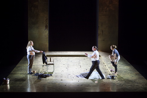 Ausstatter Henrik Ahr begnügt sich zunächst mit einer leeren, schwarzen Bühne, auf der im Hintergrund allmählich eine teilbare Holzwand erwächst, während ein Teil der Decke von einem rechteckigen Spiegel besetzt wird, der das Geschehen auf dem Bühnenboden recht gruselig verzerrt. Am Prägnantesten in der Saufszene des letzten Akts. Eine vorzügliche Idee. Weniger die langweiligen, von Barbara Drosihn designten Alltagsklamotten.