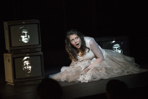 In der Ankündigung war schon zu lesen, dass erst kurz vor Beginn Einlass gewährt wird und Teile des Chores und Orchester im Zuschauerraum anwesend sein werden. Nun endlich darf man rein und saugt gleich neugierig die ersten Eindrücke auf. Da sitzt Radames auf der Bühne zusammengekauert mit einem weißen Kleid im Arm. Der Orchestergraben ist zugedeckt, so dass er ganz nah an den Publikumsreihen sitzt. Eine schmale Schräge reicht in die ersten Reihen hinein. Eine große Leinwand hängt über einem Tisch und zeigt die Direktübertragung dessen, was auf ihm passiert. Neben einer leeren Tasse liegen da eine alte Landkarte vom Niltal und ein paar Bücher über Ägypten. Soweit wirkt alles wie ein bürgerliches Stillleben mit Fragezeichen. Radames bewegt sich auf den Tisch zu, blättert, zieht eine historische Postkarte mit verträumter Landschaft am Nil mit Pyramiden heraus und vertieft sich in den Anblick, die melancholische Ouvertüre beginnt. Der Vorhang öffnet sich, und das Orchester sitzt auf der Bühne, hinter einem transparenten lichttrennenden Vorhang. Vom Rang, in den Zuschauerraum plaziert, setzt Ramfis markig erhaben ein. Das ganze Haus wird zur Bühne. Ein beliebtes Konzept von Peters. Amneris im blauen Kleid kommt mit Tablett herein und räumt im Haus auf. Die vertraute häusliche, reale Welt von Radames und Amneris als Paar wird erkennbar. Der lustlose Alltag einer ausgelebten Liebe, eine reale Partnerschaft, in der die Frau die starke Hand führt und der Mann in eine Scheinwelt flieht. Radames wirkt der Welt entrückt, träumend, ja weltfremd und Menschen wie Berührungen ausweichend. Nur an dem weißen Kleid klammert er sich, seine Traumwelt und entrückte wahre Liebe namens Aida symbolisierend. Das Phantom tritt auf, bleibt aber entrückt, und die beiden finden nicht zusammen.