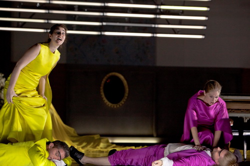 Zum Schluss, bei der Aufdeckung der an die eingeschlichenen Liebhaber verheirateten Frauen, ist die Bühne leergeräumt und das Personal der Oper, einschließlich des Chores sowie der zeitweise sichtbaren Bühnenarbeiter, treten in Alltagskleidung der Jetztzeit auf. Alle singen brav die besänftigenden Worte des Schlusstextes, stehen dabei steif und regungslos da, scheinbar ohne rechtes Bewusstsein der Geschehnisse, ja, anscheinend nicht einmal in Unruhe oder Zweifel über die richtige Partnerwahl. Die Darsteller wirken nach allem Geschehen wie ein beziehungsunfähiger, trauriger Rest der zuvor so spielfreudigen Truppe.