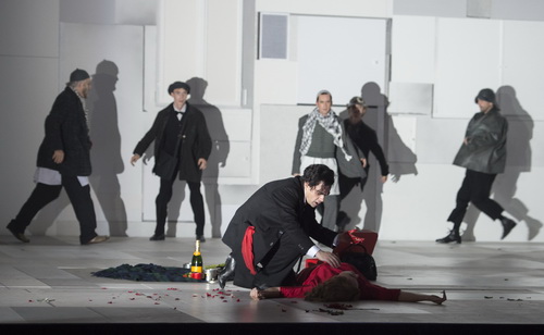 Claus Guth inszeniert Juliette als packenden Mystery-Krimi, bei dem vieles in der Schwebe bleibt. Leidet Michel, der wie ein clownesker Wanderer die Welten durchstreift, an Halluzinationen, oder ist es ein Traum, in dem sich Realität und Phantasie vermischen? Die Einheitskulisse von Alfred Peter hat einen großen Anteil an der Faszination des Abends. Ein unmöbliertes, weißes Zimmer mit unzähligen Öffnungen, aus denen Menschen und Requisiten, virtuos choreografiert von Ramses Sigl, purzeln und wieder verschwinden, wird im zweiten Akt durch überdimensionale Pflanzenblätter zu einem phantastischen Wald und erscheint im dritten, quasi als Erinnerung, in verkleinerter Form. Wenn im letzten Akt Wolken den Bühnenraum diffus vernebeln, entspricht das exakt der nebulösen Atmosphäre des Geschehens. In diesem Land gibt es kaum Farben und dementsprechend sind die Kostüme von Eva Dessecker in Grau- und Schwarztönen gehalten, nur das Kleid von Juliette und Accessoires wie Gürtel oder Rosen stechen in leuchtendem Rot heraus.