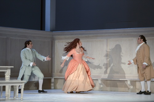 Neben Radvanovsky gelingt es Stefano La Colla nur teilweise, ausgewogen zwischen Spielen und Singen Des Grieux‘ zu charakterisieren. Dass sein schauspielerisches Repertoire begrenzt ist, wird schon nach wenigen Szenen deutlich. Mehr statisches Positionshalten als gestische Beweglichkeit. Seinem Tenor fehlt vor allem in einzelnen erotisch sinnlichen Szenen die Grandezza-Geschmeidigkeit, die man von italienischen Tenören in der Regel erwartet. Sein Arioso Sei splendida e lucante! könnte ein furioseres Mehr durchaus vertragen.