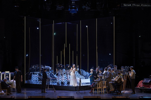 Das Bühne-in-Bühne-Konzept von Designer George Tsypin lässt uns sowohl hinter die Bühne sehen wie auch auf die Aktion auf dem Set, komplett mit echtem Auto, was sich immer gut macht. Der Video-Künstler Robert Pflanz erzählt mit seinen Projektionen die Realität – visuelle Zitate aus der Zeit wie auch die Aufnahmen der Hauptdarsteller – immerhin sind wir ja in Hollywood. Kostüme von Ursula Kudrna sprühen von Fantasie – Manon als femme fatale in Pelz und Seide, der Chor in einer Vielzahl an Komikfiguren – Hasen, glitzernde Stripper-Girls, Men in Black und vielerlei mehr.