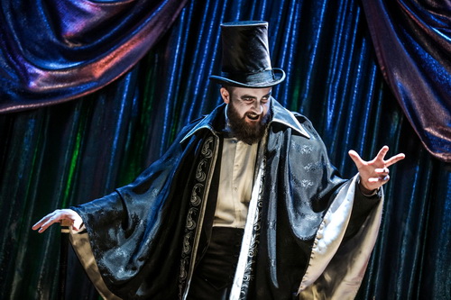 Mit spontan wirkenden Gesten und Reaktionen verfolgen sie den Auftritt des Zauberers Cipolla, den David Oštrek dank seines nuanciert eingesetzten Bassbaritons, seiner dämonischen Ausstrahlung und seiner hünenhaften Gestalt zum absoluten Mittelpunkt macht. Dreimal fällt in Amos‘ Inszenierung am Ende der Schuss. Wie im Film wird die Handlung zurückgespult und eine neue Variante gespielt. Wer den Zauberer ermordet, ist der eigenen Sichtweise überlassen.