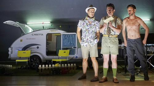 Ehe Matthias Behrends, Leiter des Opernstudios Bern und Regisseur des Abends, sich der spielerischen Umsetzung widmen kann, muss er erst einmal eine Menge Material auf der doch eher überschaubaren Bühne unterbringen. Im linken Drittel sitzen dichtgedrängt die Musiker. Auf der „Seitenbühne“ findet auch noch ein präpariertes Klavier Platz. Die Mitte bleibt einem Caretta-Camping-Wagen vorbehalten, vor dem noch ein künstliches Gärtchen angeordnet ist. Rechts ist eine ganze Batterie von Perkussionsinstrumenten untergebracht. Weniger eingefallen ist Kostümbildnerin Sun Sun. Der deutsche Graf kreuzt in kurzen Hosen auf, Verwalter Durman bekommt erst gar kein Oberteil und der Schafhirte ganz in Weiß will auch nicht so recht zu den sonst typisierenden Kostümen passen. Eingeleuchtet ist das Ganze von Florian Kunz mit grobem Strich – mehr Feinheiten ließe wohl die Aula-Technik auch kaum zu. An mehr Bilder ist gleichfalls nicht zu denken, also muss Behrends die Handlung an anderen Orten darstellen lassen. Köstlich, wie drei Darsteller den Absturz in den Alpen mimen. Immer wieder gelingen dem Regisseur solche durchdachten Einfälle, bei denen auch mal geschmunzelt werden darf, ohne ins Komödiantische abzugleiten. Seine Personenführung lässt niemanden seiner Studenten allein, ohne sie zu unterfordern. Mit einem wahrhaft voluminösen Schlussbild gelingt ein furioses Finale, das den Zuschauern im ausverkauften Saal sicher noch lange in Erinnerung bleiben wird.