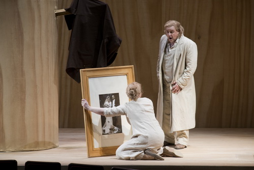 Vorder- und Hinterbühne bestehen aus Theatersesseln, wie sie in der Semperoper benutzt werden, das eigentliche Geschehen findet auf der Mittelbühne statt, abgetrennt durch einen durch die Protagonisten aufziehbaren Theatervorhang. Schnell wird klar, hier entsteht ein Theater im Theater, ein Erklärstück für Wagner-Anfänger oder für die, die es immer noch nicht verstanden haben. Gottvater Wotan ist der Regisseur seiner eigenen Inszenierung, mit der er am Ende scheitern muss. So erscheint er schon zu Beginn des ersten Aufzuges und bringt das Zwillingspar in Hundings Hütte zusammen. Dabei betrachtet er ein Kastenmodell des Bühnenbildes des ersten Aufzuges.