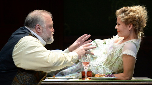 Hans-Peter König als Falstaff verströmt mit seinem voluminösen, kultiviert geführten Bass reinen vokalen Balsam. Allerdings sind seine komödiantischen Fähigkeiten begrenzt. Das ist zwar immer noch besser als das klamaukhafte Schmierentheater mancher seiner Kollegen, vor allem aus früheren Zeiten. Die Längen des Abends vermag freilich auch er nicht zu lindern. An Spielwitz und stimmlicher Biegsamkeit mangelt es Anke Krabbe als Frau Fluth ebenso wenig wie Martha Marquez als Frau Reich. Dass Luiza Fatyol als Jungfer Anna mit ihrer recht schweren Stimme unter den Damen die stärksten lyrischen Qualitäten aufweist, passt zur nachdenklich ausgerichteten Stoßrichtung der gesamten Produktion.