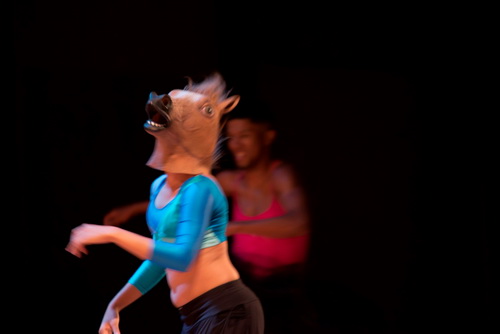 Auf der leeren Bühne zeigen die Tänzer, anfangs schleppend, was Passinho alles zu bieten hat. Das ist nicht immer ganz so aufregend, wie man es sich vorstellen mag. Pubertäres Gerangel unter Jungs sorgt mitunter für allzu bereitwilliges Gelächter im Publikum. Einzelszenen verdichten sich nicht zu einem Handlungsstrang oder auch nur zu einer Einheit. Es ist halt ein battle. Das ist alles ein wenig mühsam. Andrea Capella schafft da auch mit sparsamen Weißlicht-Wechseln oder zaghaftem Einsatz von Stroboskop-Licht wenig Reiz. Und die Kostüme von Paula Stroher sind schnell erkannt: Die streetgang-Mitglieder in Muscle-Shirts und mit Bilker Ballonseide an den Beinen, der Travestie-Künstler und zum Ende gibt es Tiermasken, deren Bedeutung sich allerdings nicht so recht erschließt. Ist halt bunt und lustig.