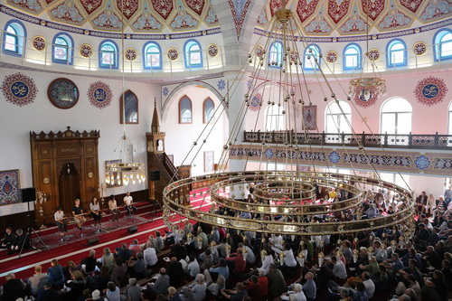 Schuhe sind auf dem Teppich des Gebetshauses verboten und Stühle sucht man vergeblich. Furkan Avci, der Imam der Moschee, leitet mit einer koloraturreichen Lesung eines nachdenkenswerten Ausschnitts aus der 55. Koran-Suite mit einer an die Toleranz appellierenden Botschaft die zweistündige Veranstaltung ein. Fremdartig wirkt das schon, aber in seiner ruhigen Intensität unter der reich verzierten Kuppel erinnert es an die große Kultur des Islams, die nichts mit dem Terror gemein hat, für den der Name des Islams missbraucht wird.