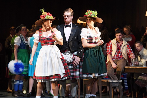 Regisseurin Katharina Thoma fasst es witzig-ironisch auf und weiß damit zu spielen. Zwischen schwerer Holztäfelung und Biedermeiertapete als Erinnerungsklammer an die Entstehungszeit versetzt sie die gelangweilte Lady und ihre Freundin Nancy in die Welt der Tablet-Nutzer. Bühnenbildnerin Etienne Pluss baute ihr hierzu einen mitten im Zimmer aufgehängten Raum in Form eines iPhones. Nancy klickt sich durch die Partnersuche, postet die Lady in Gala, strickt aus dem kurzweiligen Dialog ein Profil und drückt auf Senden. Kaum sind potenzielle Kandidaten aufgelistet, lenkt die Lady anderes ab. In fröhlichen Gesängen ziehen die Mägde vorüber. Sie wollen zum Markt von Richmond. Dahin will die Lady auch. Also schlüpft sie ins Dirndl und findet sich im schrill bunten Mix aus Wies´n-Gaudi und Love-Parade wieder. Überzeichnet brav und eigentlich fehl am Platze wirkt in diesem Umfeld Lyonel, die Personifizierung des Romantikers im Biedermeier, weder lebenstüchtig noch willensstark, nur im Extrem liebend und leidend. Sein Haus, ein alter Wohnwagen, passt ideal zu ihm als Auslaufmodell einer Gesellschaft, die den Kick sucht.