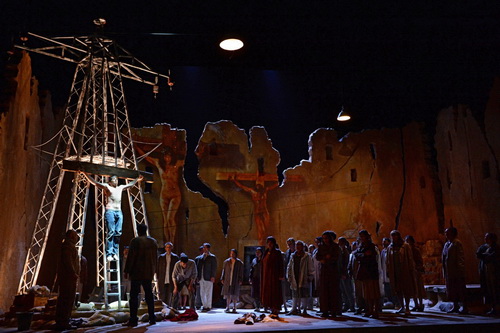 Darauf setzt Freemann. Die Darsteller entwickeln ihre Rolle weiter. Ein spannender Anspruch. Zu welchem Ergebnis das führt, könnte man nur feststellen, wenn man alle folgenden acht Vorstellungen sähe. Zur Premiere gelingt ein erster Eindruck. Jeder der 42 Darsteller auf der Bühne verkörpert sein persönliches Drama. Das schafft Authentizität und Glaubwürdigkeit und reißt den Zuschauer mitten in das Geschehen. Einzelne aus dieser Gemeinschaft übernehmen kurzzeitig eine Rolle, werden zum Propheten, verkörpern Maria und Josef, Judas und Jesus. Die Gemeinschaft der Individuen verschmilzt zum Volk, das von der Geburt des Kindes verzückt zur keifenden Masse mutiert, um mit bedingungsloser Gewaltbereitschaft Jesus hinzurichten. Das überzeugt, verstört. Bedauerlicherweise untergräbt Freeman mit einer Flut aus banalen, effektvollen und schockierenden Videoeinspielungen von Shuang Zou und Marco Devetak auf der Ruinen-Rückwand die Wirkung des Augenblicks.