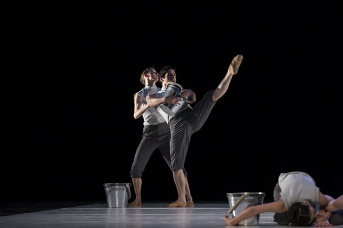 Dagegen setzt Bridget Breiner, Direktorin und Primaballerina der Compagnie, eine Neufassung ihrer 2009 in Mannheim uraufgeführten Choreografie Hold lightly, in der sie Ludwig van Beethovens drittes Klavierkonzert vertanzen lässt. Zunächst einmal wird es wunderbar hell auf der Bühne. Bonnie Beecher arbeitet ausschließlich mit Fassetten weißen Lichts. Das passt zur Bühne von Jürgen Kirner. Der benötigt erst einmal nur eine weiße Spielfläche, auf der die Tänzer sich an silberfarbenen Eimern abarbeiten können – was immer auch Eimer mit einem Klavierkonzert zu tun haben. Die Idee ist verwirrend, letztlich aber ansprechend. Für den zweiten Teil hat Kirner ein Rechteck aus vier Traversen bauen und ein geschlitztes Tuch dazwischen aufspannen lassen. Diese Konstruktion schwebt von der Decke, verändert häufig ihre Lage und bietet Breiner ausreichend Spielraum für ein zeitgemäßes klassisches Ballett. Und weil so ein Klavierkonzert reichlich lang ist, gibt es im dritten Teil noch rote Eimerchen, um die sich die Tänzer streiten können, wie man es aus dem Sandkasten kennt. Das alles ist mit Witz, Herz und Verstand, vor allem aber mit einem Höchstmaß an Können gemacht, wenn auch als Bestandteil eines Triptychons ein wenig zu lang, um nicht am Ende ermüdend zu sein.