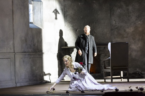 Mit dazu bei trägt auch die historisierte Ausstattung von Mathis Neidhardt mit einem Herrschaftsgeschoß, einem gräflichen Salon oben und Millers Stube, einem schäbigen Tiefparterre unten, je nach Verortung fließend wechselnd, augengleich eingerichtet und sich nur in der Qualität der Einrichtung unterscheidend, in denen ein Page oder eine ältliche Haushälterin immer mit stereotypen Handlungsweisen auftreten. Und statt auf dem Betstuhl, auf dem Miller sitzt, der hier kein Soldat ist, sondern ein Mann des Glaubens, kniet der Graf einen Stock höher vor dem riesigen Tresor, wenn er aus ihm etwas herausnimmt. Aber die Oper hat auch ihre Längen, wie etwa die eine gefühlte Ewigkeit dauernde, tödliche Schlussszene des Liebespaares.