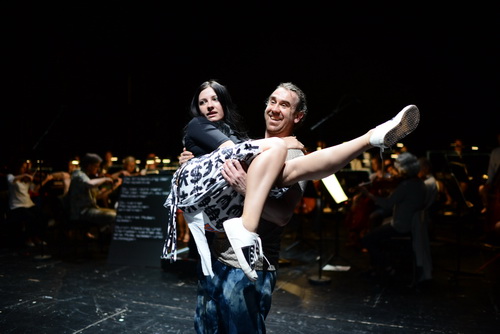 Ganz am Ende der Spielfläche sitzt zentral das Orchester mit seinem Dirigenten Markus Poschner. Das Orchester gibt gewissermaßen den traditionellen Anker vor. Es wird zwischendurch nicht immer benötigt – die Mitglieder wandeln zusammen mit Teilen des Publikums entlang der Spielfläche oder verabschieden sich zeitweise ganz vom Geschehen.