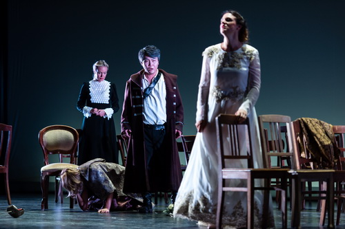 Mit der Abschieds-Arie der Leonora schließt das Werk recht unvermittelt ohne Chor-Pomp oder dramatische Zuspitzung. So wie ohnehin dramatische Entwicklungen rar gesät sind. Für Heyder kein Problem, der auf der offenen, von Hartmut Litzinger raffiniert ausgeleuchteten Bühne die Auseinandersetzungen und inneren Konflikte sehr intensiv ausarbeitet und die einzigen Requisiten, die Stuhl-Galerie, wirkungsvoll ins Geschehen integriert. Bestes Kompliment für alle Beteiligten, auch für die Kostümbildnerin Janine Werthmann, die den Chor in Einheits-Schwarz und die Protagonisten in historisch angehauchte, aber dennoch leichte Kostüme kleidet: Trotz der sparsamen Ausstattung vermisst man nichts.