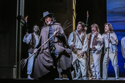 Verrückt werden hauptsächlich große Holzbauten, die an riesenhafte (Kinderzimmer-)Schränke erinnern. Philippe Miesch zeichnet für das wenig kreative Bühnenbild verantwortlich. Neben den Holzhäusern werden dem Publikum noch zweidimensionale Bäume vor blauem Hintergrund gezeigt, ebenso präsentiert er die Statue des Komturs als zweidimensionale, schwarze Figur, die auf einem Pferd sitzt und ab und zu den Kopf bewegt. Lustig? Eher nicht. Ein wenig mehr Abwechslung auf der Bühne oder plastische Darstellungen hätten dem Werk gutgetan. Auch für die Kostüme, die im ausgehenden 18. Jahrhundert verhaftet sind, ist Miesch verantwortlich. Don Giovanni kleidet er fast ganz in schwarz mit Kniebundhose, Weste, Hemd und Umhang. Donna Anna hüllt er in ein schwarzes Kleid, die anderen Damen sind unauffällig in Erd- und Waldtönen gehalten.