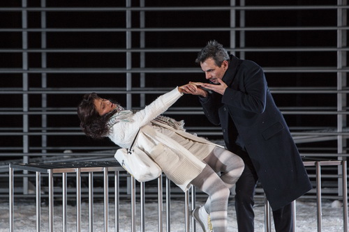 Jedenfalls ist es draußen grau und drinnen nun auch, was man natürlich nicht Regisseurin Emmanuelle Bastet und ihrem Ausstatter Tim Northam vorwerfen kann. Aber schon während der spannungsarm bespielten Ouvertüre befürchtet man, dass es ein langer Abend werden kann. So kommt es auch. Die Grundidee ihres Konzeptes ist schnell klar und spiegelt sich im Bühnenbild wider. Northam beginnt mit einem auf ein Minimum reduzierten Bühnenbild. Ein großer Schreibtisch ist Don Giovannis Ausgangspunkt, sein Reich ist wie ein Gefängnis durch zwei hohe Gitterwände an den Seiten beschränkt. Je weiter sich Don Giovanni verstrickt, desto mehr dieser Gitter tauchen auf. Aus dem Boden fahren sie nach oben, von links nach rechts rollen sie herein, von der Decke fallen sie überraschend nach unten, drohen den Verführer zu erschlagen. Das könnte spannend sein, aber man sieht sich an diesem Einheitshochglanzgitter innerhalb der ersten zwanzig Minuten satt. Auch der Schnee im Einklang mit der kalten Beleuchtung von Franҫois Thouret verliert seinen Reiz recht schnell. Denn das eigentliche Problem ist, dass man diese Bühne mit einer spannenden Personenführung nun in das Reich von Leidenschaften und Emotionen verwandeln müsste. Doch die größte Stärke in der Personenführung von Bastet ist nur die Beleuchtung des Verhältnisses von Donna Anna und Don Ottavio, denen man endlich mal zutrauen kann, dass sie ein Paar sind. So viele zärtliche Momente hat ihnen wohl noch kein Regisseur zugestanden. Auch die permanente Anwesenheit des beobachtenden Don Giovanni ist eine der wenigen – wenngleich es da einige Reibungen mit dem Text gibt – Konstanten in einer langweiligen Inszenierung.