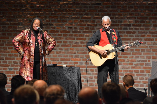 Aus kindlich-naiver vulgo amerikanischer Sicht ist es ja das Normalste auf der Welt, die Menschen im Saal zum Mitsingen beispielsweise eines Spirituals aufzufordern. In Deutschland müssen die Menschen gerade wieder lernen, dass man nicht einfach so mitmacht. Sondern sehr genau überlegen muss, wem man sich da so anschließt. Nachdem Kim erklärt, warum es auch heute oder gerade heute notwendig ist, darüber zu singen, dass wir „es“ überwinden werden, erhebt sich das Publikum langsam, aber ohne Zögern und singt gemeinsam mit Kim und Reggie Harris sowie Oni Wytars, die sich wieder auf die Bühne gesellt haben, um gemeinsam mit den Amerikanern zu musizieren – diesmal klingt ihr Venite a laudare erheblich gelöster und freudiger – und dabei mag sich jeder so seine Gedanken gemacht haben, was es eigentlich zu überwinden gilt.