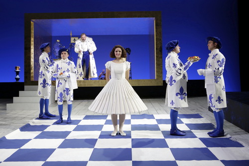 Brigitta Gillessen, die Leiterin der Kölner Kinderoper, kehrt in ihrer Inszenierung den märchenhaften Charakter des Stücks heraus und lässt die Figuren puppenhaft agieren. Auf dem Schachbrettparkett der von Christof Cremer gestalteten Bühne erinnern sie an Spielfiguren, die scheinbar von dem autonom handelnden König gesteuert werden, der auf einer erhöhten, Kasperletheater-ähnlichen Mini-Bühne residiert, ohne zu merken, dass die anmutig-naiv vor sich hin trippelnde Bauerstochter die Hohlheit der zur Schau gestellten Macht des Königs mit jeder Aktion bloßstellt. Das wird selbst den nicht gerade hellköpfigen Strolchen bewusst. Wie gewohnt, zeugen sowohl die Sensibilität der Regisseurin als auch die Fantasie des Bühnen- und Kostümbildners von einer erfreulichen Liebe zu ihrer Aufgabe und ihrer Intention, jüngere Besucherschichten ans Musiktheater heranführen zu wollen. Szenisch kommt keine Langeweile auf.