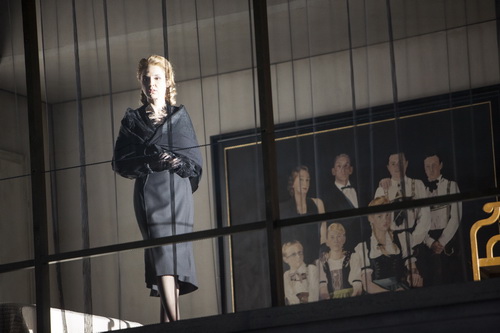 Christian Schmidt lässt sich für das Einheitsbühnenbild von der authentischen Villa Tugendhat inspirieren und schafft damit zwei Spielebenen, deren untere, wie gesagt, für große Teile des Publikums uneinsehbar bleibt. Anders die großen rechteckigen Fenster im ersten Stock des klobigen Baus, die unter anderem den Blick in das Schlafzimmer ermöglichen. Eine nüchterne Kulisse ohne atmosphärische Reize, nicht mehr und nicht weniger.