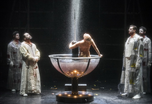 Gezeigt wird die Wiederaufnahme einer Inszenierung von Carlus Padrissa, die vor drei Jahren auf die damalige Ersatzspielstätte im Musical Dome ausgerichtet wurde. Weil die damalige Bühne aber wesentlich mehr Raum anbot als der jetzige Saal 1 im Staatenhaus, muss die Wiederaufnahme abgespeckt werden. Abstriche schmerzen, also wird so wenig wie möglich vom Original weggelassen. Das ist nicht nur mutlos, sondern zeigt auch wenig Kreativität. Das Orchester ist links neben der Bühne untergebracht. Auf der Bühne sind die riesigen Stahlelemente erhalten geblieben, auf denen eine überbordende Menge von Statisten untergebracht wird, die teils unter atemberaubenden, wenn nicht lebensgefährlichen Bedingungen arbeiten müssen. Denn der Abstand von der Spitze einer der verschiebbaren Viertelkugeln bis zur Decke ist an manchen Stellen nicht einmal mehr mannshoch. Die verbleibende Spielfläche erinnert eher an eine Studiobühne, auf der wahlweise ein Tisch mit Leuchtfläche in verschiedensten Funktionen oder der „Gral“, ein überdimensionierter, wassergefüllter Acryl-Kelch mit einem phallusähnlichen Mittelstück, im Mittelpunkt stehen.