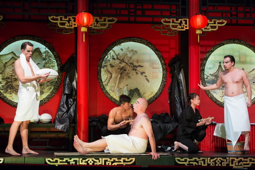 Für große Nachhaltigkeit sorgen Jonathan Mitchie als Ping, Sergei Pisarev als Pong und Keith Boldt als Pang. Die drei Minister werden hier als korrupte Opportunisten dargestellt, die durch ihr hintergründiges Spiel begeistern. In ihrem großen Terzett zu Beginn des zweiten Aktes dürfen sie ihrem traditionellen Wesen nachgeben und offenbaren ihre tiefen Sehnsüchte nach der Heimat und einer besseren Vergangenheit. Musikalisch ist das Terzett bewegend gesungen, die drei Stimmen harmonieren dabei auf das Beste. Randall Jakobsh singt und spielt den blinden Timur mit balsamischem Bass, seine Erschütterung nach dem Tode Liùs ist ein bewegender Moment an diesem Abend. Martin Petzold als irre gewordener Kaiser Altoum und der markante Sejong Chan als Mandarin runden ein außergewöhnliches Sängerensemble an diesem Abend ab.