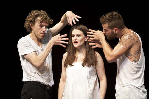 Ein Duo, das in seinem Zusammenspiel und -tanz so viel herzliche Einheit zeigt wie Luc Dunberry und Joel Gómez Suaréz sucht man sonst wohl vergebens. Die beiden Männer zeigen neben großem tänzerischem Ausdruck auch eine enorm emotionale Bandbreite, mit der sie in den Bann ziehen. Dunberry überrascht zudem mit einer sonoren und klaren Gesangsstimme, Suaréz verausgabt sich in seinem Solo mit Schellen an den Füßen. Richtig schelmisch treiben die beiden die „Handlung“ voran und tollen ausgelassen wie zwei Kinder über die Bühne, zeigen sich aber auch verletzlich, stark, empfindsam und einsam. Magnus Anderson lässt nicht nur seine Finger auf der Laute tanzen und entlockt ihr längst vergangene Klänge, auch er wird Teil der Handlung und muss sich so einiges gefallen lassen. Dass sein Spiel ohne Makel ist, ist nur die Vervollständigung der Versammlung von künstlerischer Persönlichkeit auf dieser kleinen Bühne. Darstellerisch verlangt das Konzept den Mitwirkenden einiges ab: Neben den Kieselsteinen, die barfuß betreten werden, wird über den Boden geschleift, getragen, umgezogen und auch Sängerin und Musiker müssen tanzen, aber vor allem ist Nähe gefragt – und die kann nur wirkungsvoll strahlen, wenn sie auch tatsächlich da ist.