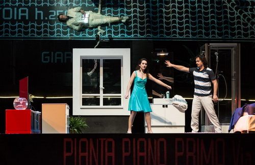 Mit leichter Hand und viel Tempo bringt Regisseur Damiano Michieletto die ebenso turbulente wie harmlose Handlung in Schwung. Bühnenbildner Paolo Fantin gestaltet den Raum nach dem Grundriss einer Architekturskizze, die sich auch noch im Hintergrund spiegelt und verblüffende optische Effekte bereithält. Eine Statistenschar sorgt während der Ouvertüre für die nötige, moderne Einrichtung, die den Herren, die auf der von Giulia gespannten „seidenen Leiter“ in ihr Gemach dringen wollen, viele Versteckmöglichkeiten bietet. Die haben sie auch bitter nötig.
