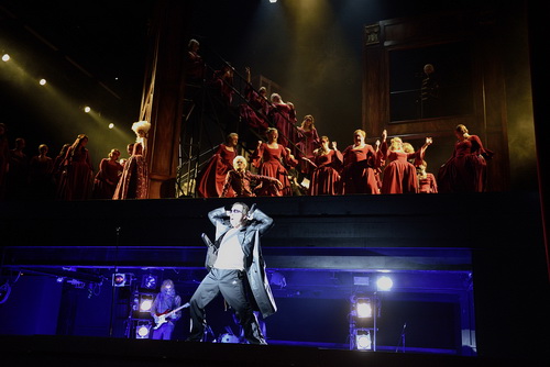 Und die Sache mit der Kunst? Ist er nicht Künstler und Dichter? Wird er nicht von der Muse gerufen und begleitet in ein neues, auf Liebe verzichtendes, überhöhtes, und rein der Kunst gewidmetes Leben? Nicht so in dieser Produktion, in der Florian Lutz alle schöngeistigen Klischees, sentimentalen Attitüden in seinem Regiekonzept streicht und konterkariert. Schön krass zum Beispiel mit einer unmittelbar der Barcarole folgenden, bei hochgefahrener Unterbühne gekrachten Einlage einer Rockband mit Jan Stöber an der E-Gitarre, Till Baumann am E-Bass und Benjamin Schmidt am Drum-Set. Die Jungs hauen mächtig drauf und begleiten unseren verzweifelten, wütenden Jean-Noel Briend als rockenden Hoffmann, der sich zu einem ‚chant brachique’ mit Motiven aus der Oper über die Liebe auskotzt.