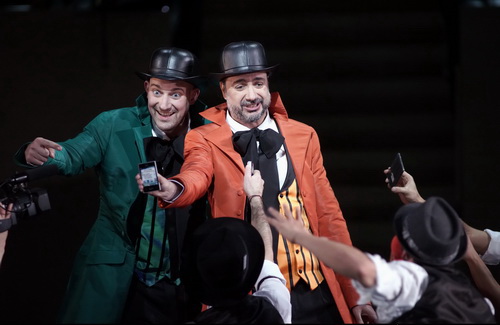 Funkelnd und brillant, spritzig und con brio, startet Musikdirektor Ivor Bolton mit dem bestens aufgelegten einstudierten Titularorchester des Teatro Real, dem Orchestra Sinfónica de Madrid. Frisch, luftig und leicht klingt es, Kastagnetten klappern, ganz klar, wir befinden uns im Süden. Das Orchester musiziert die rund achtminütige Ouvertüre bei geschlossenem Vorhang, doch unter der wachen Obhut des jungen Wagners, dessen groß projiziertes animiertes Bildnis rege Anteil nimmt : aufmerksam, nachdenklich, lächelnd, auch zugleich amüsiert, augenzwinkernd; distanziert, doch wohlwollend selbstironisch zuhörend blickt er auf das Orchester herab.