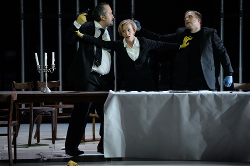 Wer auch immer schon das Gefühl hatte, für den Besuch einer Grand Opéra wegen der gefühlten Länge eine zweite Lebenszeit mitbringen zu müssen, sollte sich diese Produktion ansehen. Nicht nur strafft Regisseur Peter Konwitschny die Handlung in ein von Solisten und Chor packend gespieltes Kammerspiel unter wohltuender Weglassung allen überflüssigen Beiwerks auf rund drei Stunden, sondern vermag außerdem im Wege der Abstraktion das hochaktuelle Thema der religiösen und politischen Fanatisierung spannend auf den Punkt zu bringen.