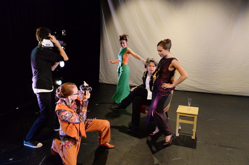 Kleider machen Leute heißt das „Tanztheater-Projekt“, das Behnke entwickelt und zu dem Jorge Escobar die Texte beigesteuert hat. Es geht um Mode. Oder um Bekleidung? Oder um Identität? Kaum hat das Stück auf der Studiobühne des Theaters Mönchengladbach begonnen, fangen auch die Schwierigkeiten an. Begriffe werden nicht sauber geklärt und getrennt. Stattdessen gibt es verquaste Dialoge, die von einer unsäglichen Logorrhoe und Langeweile geprägt sind. Daran kann auch der engagierte Vortrag der Jugendlichen nichts ändern. Dabei fängt es eigentlich charmant an. Lorenz Hansen hat die Darsteller auf ihrer Entdeckungsreise im Fundus des Theaters mit der Videokamera begleitet. Das Ergebnis wird auf einem weißen Vorhang im Hintergrund der Bühne von Dirk Peltzer präsentiert. Die Seitenbühnen sind schwarz verhängt. Auf der linken Seite sieht man die Fassade einer Wirtschaft, vor der ein paar Tische und Stühle stehen. Nach dem Video wird der Vorhang beiseite gezogen. Dahinter taucht das Prospekt eines Busses auf, neben dem ein Felsstück und ein paar Pflanzen Platz finden.