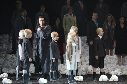 In München ist die Bühne in der Gestaltung von Martin Zehetgruber den ganzen Abend mit weißen Totenköpfen übersät, über die der Chor, die Statisten und Sänger mehr oder weniger elegant balancieren. Ein Zelt am rechten Bühnenrand symbolisiert das Unheil und deckt die Gräueltaten zu, die zumeist im Inneren stattfinden. Grelle Lichteffekte verschärfen ab und an das martialische Grauen.