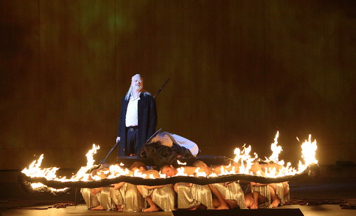 Mit viel Vorfreude strömt das Münchner Publikum ins ausverkaufte Nationaltheater. Die Besetzung dieser Walküre lässt die Herzen der Fans von Klaus Florian Vogt höher schlagen. Und schon in der Ouvertüre darf der Held mutig das Schwert schwingen und im Kampfe ermattet vor dem Hause Hundings niedersinken. Die Münchner Ring-Inszenierung von Andreas Kriegenburg ist aufwändig bebildert. Die Statisterie hat alle Hände voll zu tun. In Hundings Hause werden die verwundeten oder getöteten Krieger versorgt, junge Mädchen eilen zwischen dem Liebespaar Siegmund und Sieglinde symbolhaft mit Lichtern hin und her und bilden so eine leuchtende emotionale Brücke der entflammenden Liebe.