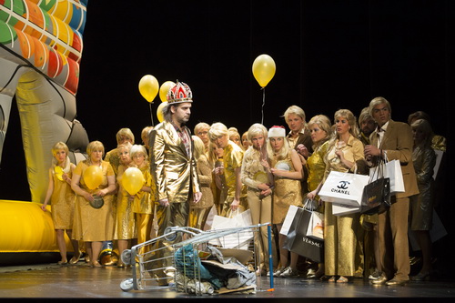 Kasperletheater und goldene Zeiten sind bei Bühne und Kostümen von Timo Dentler und Okarina Peter sowie der Lichtgestaltung von Olaf Lundt wörtlich zu nehmen. Zum einen dirigiert der Adel das Volk von einem überdimensionierten Kasperletheater, das am Ende der Krönungsszene in einer krachenden Implosion zusammenfällt und als beherrschendes Theaterrequisit auf der Bühne lange gegenwärtig bleibt.