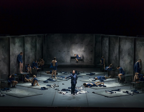 Auf der dunklen, kahlen Bühne von Eva Adler und Goyo Montero blickt man immer wieder in einen abgeschlossenen, grauen, nahezu leeren Raum mit Tisch und Stuhl wie in das Zimmer einer Irrenanstalt, Symbol wohl für die innere, verborgene, unzugängliche Welt eines Wahnsinnigen, aus der er sich kaum befreien kann, es sei denn in seinen Träumen. In denen erblickt er immer wieder sein unerreichbares Sehnsuchtsziel, eine fixe Idee, aber auch andere Wesen, die ihn bedrängen, Doppelgänger, Schatten, Spiegelbilder, die Gesellschaft um ihn herum, die er nicht versteht. All das verwirrt, verstört ihn. Sie begegnen ihm vor allem in einem hohen Raum mit Vorhängen, spähen dazwischen heraus, formieren sich zu Figuren, in denen er sich verliert. Sie verstören ihn mit ihren Aktionen, etwa im zweiten Satz beim Ball, als die weiten schwarzen Röcke ihn im Walzertakt umkreisen, und als dunkle, gesichtslose Masse in ihren Einheitsanzügen oder Trikots von Angelo Alberto und Goyo Montero verstärken sie das Bedrohliche. Manchmal auch irritiert den Mann das Licht, das hinter der Mauer weitere Gestalten ahnen lässt oder ihn blendet; Olaf Lundt gelingt damit ein raffinierter Effekt.