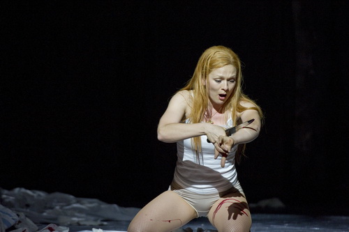 Dieser Rigoletto aber ist hier kein Buckliger oder ein Hofnarr, sondern ein Mann, der dem Herzog nach dem Mund redet, weil er sich davon Vorteile erhofft. Die Verkleidung eines Zirkusclowns aber legt er nur an, wenn er verzweifelt ist, wirklich zu sich kommt, nicht nur eine Rolle spielt; möglicherweise deutet sie auf seinen früheren Beruf hin. Denn er schleppt in dieser Maskierung während der Ouvertüre seine da noch kleine Tochter Gilda quer über die Bühne, bevor die eigentliche Handlung in eine deprimierende Gegenwart entführt. Das folgende frohe Fest, das dank des unverschämten Auftretens des Herzogs jäh gestört wird, bildet nur einen Kontrast zu der bald sich anbahnenden Katastrophe. Denn Gilda, schäbig angezogen, ist verbannt, eingesperrt in einen unterirdischen Verschlag, den sie nur selten verlassen darf. So fällt sie umso leichter auf die Liebesschwüre des vermeintlichen Studenten, des Herzogs, herein, als er sie im Hof überrascht. Als er sie verlassen muss, ritzt sie sich Arm und Bein mit einem Messer; und am Schluss, als sie sich für den untreuen Geliebten in der düsteren Kulisse der Spelunke von Sparafucile opfert, liegt sie nicht sterbend im Sack, denn der enthält nur einen Koffer, sondern ersticht sich vor den Augen ihres Vaters. Dass Rigoletto mit seinem Auftreten die Macho-Gesellschaft auch provoziert und dabei das Maß verliert, wird drastisch vorgeführt, als er einen Stierkopf herbeischleppt und höhnisch verlangt, der gehörnte Bräutigam, Ceprano Suren Manukyan, solle auch geköpft werden. Das bringt die Leute des Ortes, eine in sich abgeschlossene Gesellschaft, endgültig gegen ihn auf. Als er versucht, das böse Spiel fortzusetzen mit der Entführung der schönen Braut, Zinovia Zaferiadou Vidovic, wird er hereingelegt; denn er bekommt einen Schweinskopf aufgesetzt, durch den er nichts mehr sieht. Zu spät merkt er, dass er bei der Entführung der eigenen Tochter mitgewirkt hat, die nun den lüsternen Blicken und obszönen Gesten der Männer ausgesetzt ist und schließlich dem Herzog ausgeliefert wird. Mit dem Verlust ihrer Unschuld und später mit ihrem völlig unverdienten Tod erfüllt sich der Fluch von Monterone.