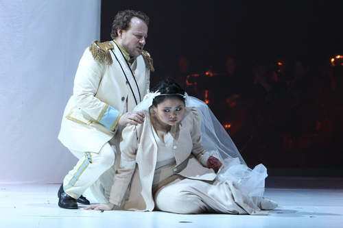 Yona Kim, inzwischen mit deutschen Theatern bestens vertraute Regisseurin und Librettistin, bringt in Osnabrück einen eher traditionellen Lohengrin auf die Bühne, der den Vorgaben des Librettos weitgehend folgt. Margrit Flagner und Hugo Holger Schneider schaffen eine karg ausgestattete, häufig hinter einem Gazevorhang verschwimmende Bühne, auf der nur einige, auf den Seitenflächen schlecht zu erkennende Projektionen und eine Hintergrundprojektion den Bezug zur Handlung herstellen. Die Kostüme erinnern an k.-u-k.-Zeiten, der Chor erscheint in einem fahlen Weiß-Grau. Kim hat das Orchester in den hinteren Bühnenraum platziert und dadurch den Bewegungsraum der Protagonisten erheblich eingeschränkt. Das mag mit dazu führen, dass den Zuschauern auf der Bühne relativ wenig Bewegung geboten wird, der Gesamteindruck bleibt recht statisch.