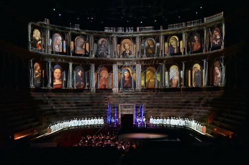 Für das Verdi-Festival finden auch Opernabende Zugang in das Theater, das dafür völlig umgestaltet wird. Das Publikum sitzt auf der Bühne und der einer römischen Arena nachempfundene Zuschauerraum wird die natürliche Bühne mit seinen Stufen und den abschließenden Bögen. Die Möglichkeiten der Gestaltung sind in dem denkmalgeschützten Raum und Weltkulturerbe limitiert. Im eigentlichen Parkett hat das Orchester Platz genommen, eine runde Plattform bildet die Bühne in Ergänzung der ansteigenden Sitzreihen. Dank der modernen Videotechnologie und Beleuchtung gelingt ein mächtiges beeindruckendes Spektakel, ganz im Sinne der Geschichte des Theaters, weniger der Kunst, da die Konzentration des Zuschauers abgelenkt wird. Die unglaubliche Größe des Theaters verstärkt auch die Distanz zum musikalischen Geschehen, wobei die Akustik des Raumes überrascht.
