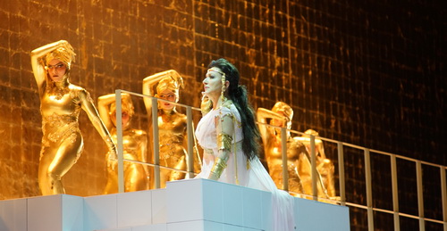 Nach einer Inszenierung im Jahre 2002 wurde diese Oper nunmehr wieder bei den Salzburger Festspielen angesetzt. Wie Alvis Hermanis, der auch für die Bühne verantwortlich zeichnet, schon im Vorfeld mitteilte, wollte er lediglich ein schönes Märchen erzählen. Herausgekommen ist ein kaum je dagewesenes, opulentes, unfassbar buntes Ausstattungsspektakel ohne jegliche Deutung oder Aktualisierung. Auf die Komplexität des Stückes wird gar keine Stellung bezogen. Neben farbenfrohen Gewändern, die Kostüme stammen von Juozas Statkevicius, und Unmengen von überdimensionalen Turban-Trägern gibt es einen echten, süßen, kleinen Esel, einen unechten, riesigen, weißen Elefanten, auf dem Jupiter, standesgemäß mit goldenem Riesenturban bei seinem ersten Auftritt einreitet. Gespielt wird vor einer weiß gekachelten Kulisse mit Podien, die immer wieder mit projizierten Ornamenten und echten Teppichen verziert wird. Es ist eine wilde Mischung aus Kitsch und Orientalik. Obwohl viel Ballett in goldenen, hautengen Kostümen die Szenerie immer wieder aufmischt, ist von einer eigentlichen Personenführung wenig zu merken. So begleitet die Titelheldin etwa ihren Gesang meist mit tänzerischen Posen und Verzierungen mit den Armen.