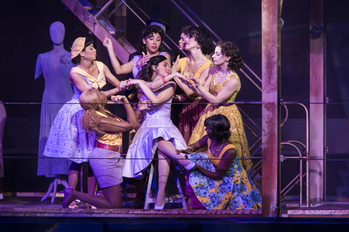 Sicherlich muss jede neue Interpretation dieses großen Welterfolgs mit der so bekannten Broadway-Produktion und dem unvergesslichen Film konkurrieren. Der Ansatz der Pfingstfestspiele, hier ein Opern- und ein jüngeres Musical-Publikum anzusprechen, ist nachvollziehbar, aber er zeigt auch die Grenzen der beiden Genres auf. George Tsypin löst seine Aufgabe des Bühnenbildes für diese doppelte Deutung des Inhaltes der modernen Geschichte von Romeo und Julia in den Hinterhöfen und der Unterwelt New Yorks mit viel Einfühlungsvermögen. Geschickt verkleinert er die große Bühne, zentriert das gesamte Geschehen, gestaltet die verschiedenen Orte in räumlicher Nähe durch einen mehrstöckigen fahrbaren Gerüstaufbau, in dem sich auch die Außenwände je Stockwerk verschieben lassen. So kann die Handlung ohne jeglichen Umbau durchgängig fließen, die der geniale Komponist Leonard Bernstein mit seinen unvergesslichen Welthits vertont hat. Erklingen die Höhepunkte wie Tonight, Maria, I want to be in America oder I feel pretty, sind die wehmütigem Erinnerungsseufzer im Publikum unüberhörbar. Liam Steel lässt in seiner Choreografie die verfeindeten Jets und Sharks sehr lebendig und ausdruckstark über die Bühne wirbeln und die Gefolgsdamen der Jugendgangs zu heißen Rhythmen die Röcke und Beine schwingen. Es kommt richtige Broadway-Stimmung auf. Die junge Besetzung singt, tanzt und spielt mit viel Euphorie und amerikanischer Unbekümmertheit. George Akram als Bernardo, dem Führer der Sharks und Bruder von Maria, sowie Dan Burton als Riff dem Führer der Jets seien stellvertretend für ihre Gangmitglieder genannt, die allesamt mit viel Herz und Können den Abend gestalten. Karen Olivo entwickelt ihre Interpretation der Anita, der Freundin von Bernardo und intime Vertraute von Maria, mit viel Bühnengespür, Persönlichkeit und einer großen, kraftvollen Stimme in Sprache und Gesang.