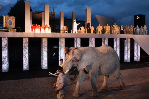 Ein tragendes Element der Oper sind die Chorpartien, die dieser Oper den Beinamen „Choroper“ einbringen. Das wird vor allem gegen Ende des zweiten Aktes deutlich, wenn große Chorpartien die Dramatik der Handlung stützen und steigern. Ein musikalisches Glanzstück ist der bekannte Triumphmarsch, bei dem auch die speziellen Fanfarentrompeten gespielt werden. Die lebende Elefantendame Mala und zwei Kamele unterstreichen den Triumph, der die Fertigstellung des Suezkanals 1870 in Kairo für Ägypten bedeutet. Der Platz vor der Pyramide bietet hervorragenden Raum, diese Zutaten wirkungsvoll zu präsentieren. Auch wenn Rootering und Fauchère auf große Gesten nicht ganz verzichten, hüten sich beide davor, diese Aida in eine pompöse Ägypten-Revue zu verwandeln. So bleiben viele Passagen thematisch authentisch.