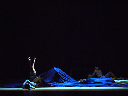 Ein Stuhlkreis auf der Bühne, ein Tisch, zwei Eimer voller Sand, mehr braucht das Bühnenbild in Rosamund Gilmores Inszenierung nicht, um das Tanzstück Der Fremde nach dem Roman von Albert Camus auf die Bühne des Theaters Trier zu bringen. Die Bühne tritt zurück zugunsten der Musik von Komponistin Susan Oswell und ihrer Choreographie.