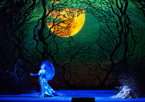 Mit dieser Rahmenhandlung lässt Adrian Noble seine Inszenierung von Hänsel und Gretel an der Wiener Staatsoper beginnen, erstaunlicherweise die erste Produktion dieser populärsten Märchenoper von Engelbert Humperdinck, die meist die erste Begegnung der Kinder mit dem Genre Oper überhaupt darstellt, seit der Wiedereröffnung des Hauses 1955. Und angepasst an die Laterna magica, diesem optischen Wundergerät aus dem 19. Jahrhundert, sieht man immer kreisrunde Bilder, wie durch ein Kaleidoskop betrachtet, in Scherenschnitt-Optik, die von einem schwarzen Wald dominiert werden – die Ausstattung stammt von Anthony Ward. Mit zusätzlichen filmischen Projektionen, wie einem lächelnden, riesigen Mond, der auch mit den Augen blinzeln kann, schwirrenden Schmetterlingen oder einem riesigen, beobachtenden Auge der Hexe entsteht auch eine gewisse Fantasy-Atmosphäre. Während der schwebende Käfig, in dem Hänsel gefangen ist, mit dem riesigen Raben darauf und der große Backofen recht imposant wirken, nimmt sich das putzige, winzige Knusperhäuschen, das von unten aus der Versenkung erscheint, geradezu minimalistisch aus. Der Regisseur zeigt die Geschichte, deren Libretto von Adelheid Wette, der Schwester des Komponisten, stammt, und das absolut dem gleichnamigen Märchen der Gebrüder Grimm folgt, sehr konventionell, ohne Neudeutungsversuche, frei von irgendwelchen tiefenpsychologischen Deutungen, durchaus geeignet für Jung und Alt, ohne Langeweile mit Märchenromantik und einigen faszinierenden Bilder. Nur hätte man sich in so mancher Szene, etwa der Pantomime, etwas mehr Fantasie und Poesie gewünscht.