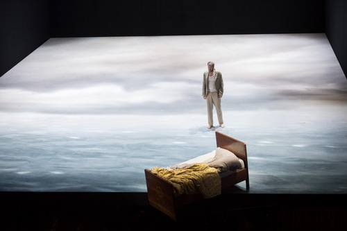 Das Holzbett hängt gefährlich an der Bühnenrampe, zum Teil schon über dem Graben, regelrecht bedrohlich für die Kontrabässe. Darin liegt schon vor Beginn Peter Grimes.Es symbolisiert offenbar den ständig drohenden Abgrund und die ständige existenzielle Grenzsituation, in der der Titelheld schwebt, und wirkt wie das Bild eines eingefrorenen Sturzes. Dahinter befindet sich eine lange Schräge, die von schwarzen Mauern begrenzt wird. Sonst herrscht nur radikal reduzierter Minimalismus vor, wie einige Stühle, sonst nichts. Die Bühne stammt von Johannes Leiacker. Während das Meer in der Musik von Benjamin Brittens omnipräsent ist, wird es bei dieser Neuproduktion von Benjamin Brittens erster Oper, die Uraufführung fand 1945 statt, am Theater an der Wien völlig ausgespart.