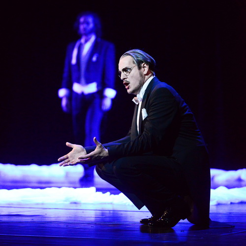 Dass die Sänger-Darsteller so überzeugen, ist ein Gewinn für die abwechslungsreiche Inszenierung. Joshua Whitener und Anja Gutgesell sowie Polina Artsis markieren die verschiedenartigen Paare, denen Harry Haller auf seiner imaginierten Lebensreise begegnet, als glaubhafte Charaktere sowohl in Gesang wie Auftreten. Barbara Schöller als von der Decke hängender Goethe oder als amüsierter Mozart bewältigt mit Bravour ihre exponierte Lage, setzt dabei ihren Mezzosopran auch jazzig ein. Rupert Markthaler als Pablo imponiert auf drei Ebenen, mit dem Saxophon, darstellerisch mit guter Figur und stimmlich. Eine herausragende Rolle hat Silke Evers als Hermine, in ihren Tanzbewegungen, durch ihre kühle blonde Attraktivität, mit der sie Harry Haller reizt, durch den Wechsel zwischen distanzierter Unnahbarkeit und emotionaler Nähe, und mit ihrem klaren Sopran meistert sie außerdem mühelos alle Intervallklippen und Höhen ihrer Partie. Als ihre Freundin Maria gefällt Polina Artsis. Im Mittelpunkt des Geschehens aber stehen Harry Haller, Daniel Fiolka, und sein anderes Ich, der Steppenwolf, Bryan Boyce. Gut, dass beide von Auftreten wie Stimme her verschieden sind: Ersterer, eher gehemmt und abwartend, hat ein weicheres, helleres Timbre, letzterer, bärtig und flapsig, ein dunkleres, fülliges. Das passt gut, und ein weiteres Plus ist bei beiden die gute Verständlichkeit.