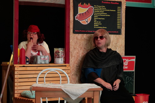 In Wuppertal gerät die Komödie in der Inszenierung von Kristof Stößel mit einer Besetzung von neun Personen zu einer Kostüm- und Dialektschlacht, die ihresgleichen sucht. Im Tanzhaus in Unterbarmen bleibt auch am dritten – und vorläufig letzten – Abend kein Stuhl unbesetzt. Stößel, der auch selbst mitspielt, tritt zu Beginn des Abends vor das Publikum, um eine Umbesetzung anzukündigen und das Versprechen abzugeben, dass um 23 Uhr wohl alle wieder zu Hause sein werden. Wenn man das um 18 Uhr angesichts einer „kleinen Komödie“ hört, heißt es erst mal: durchatmen. Schließlich sitzt das Publikum hier nicht im Fauteuil eines Opernhauses, sondern auf Stühlen, die auf dem Parkett eines Tanzsaals aufgestellt wurden. Die Bühne lässt auf Anhieb erkennen, dass hier keine großen Umbauten zu erwarten sind. Die Seitenbühnen sind mit Laken von der Hauptbühne abgetrennt, auf der im Hintergrund liebevoll die Hansi-Bar mit den klassischen Insignien wie dem Auszug des Speisenangebots, des Werbewimpels für das verpackte Eis und eine Tafel mit Sonderangeboten zurechtgezimmert wurde. Davor das typische Terrain der Pommes-Bude mit dem Resopal-Stehtisch und einem Holztisch mit zwei Plastik-Gartenstühlen. Da klebt der Geschmack von Pommes Schranke, Frikadellen und Currywurst, von Bier und Cola schon auf der Zunge, ehe noch das erste Wort gefallen ist.