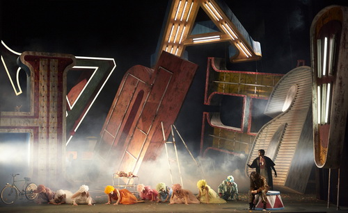 Dass die Szenerie in ein zirzensisches Umfeld verlagert wird, ist legitim. Die Clowns lärmen bereits vor der Vorstellung in den Logen und Foyers lautstark. Ein Einstieg, der in den folgenden Chorszenen zu einem Streit zwischen Anhängern der Tragödie und der Komödie eskaliert. Dass Prokofieff dabei auf den um 1920 in Russland hohe Wellen schlagenden Streit zwischen der realistischen Theaterästhetik Stanislawskis und den Reformbestrebungen Meyerholds anspielt, wird nicht berücksichtigt, was für den heutigen Zuschauer allerdings keinen Verlust bedeutet.
