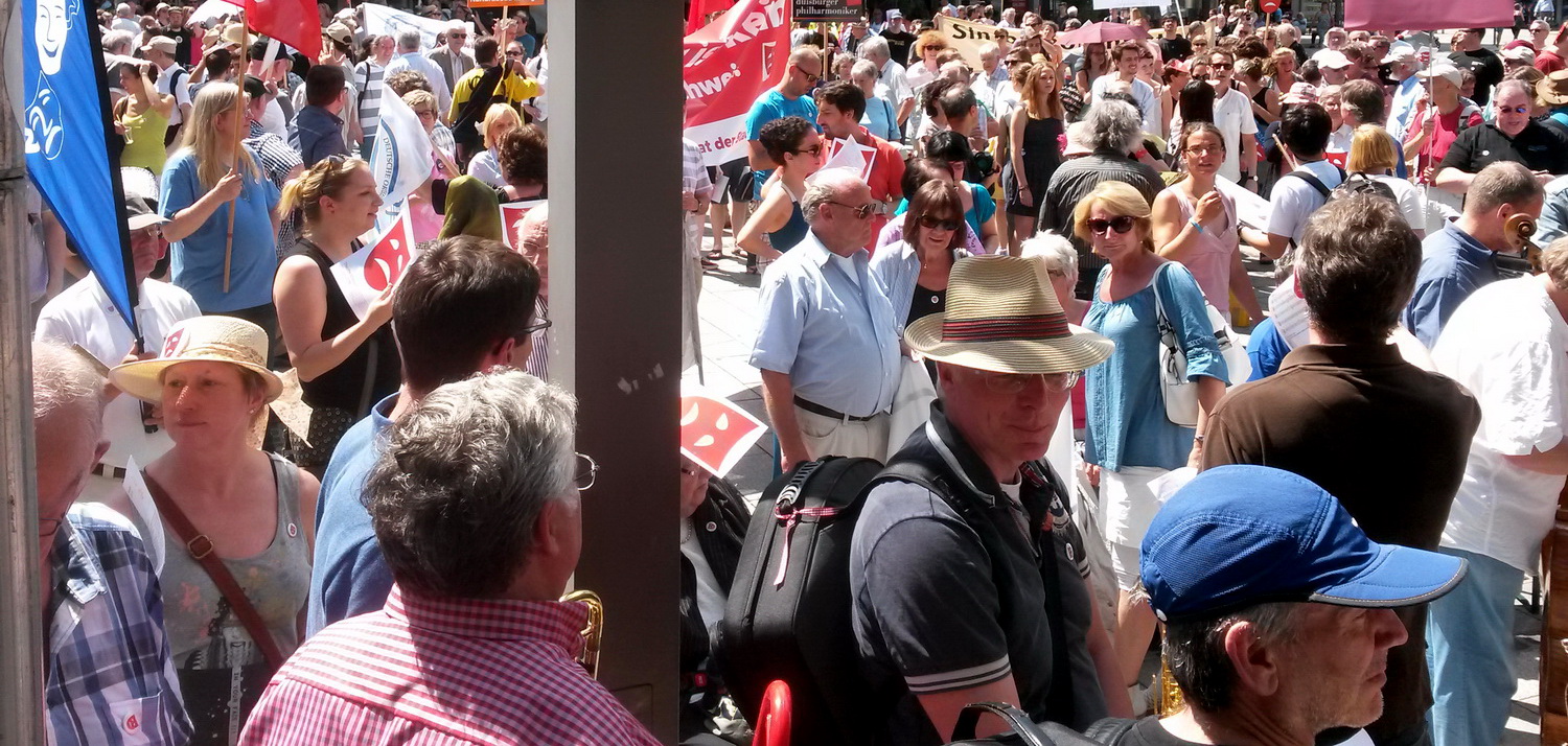 Es ist schon am Vormittag so heiß, dass einem bei hoher Luftfeuchtigkeit das Atmen schwerfällt. Rund 700 Leute, so wird die Polizei später mitteilen, hält das nicht davon ab, sich mittags auf dem Theatervorplatz in Hagen zu versammeln. Der Deutsche Gewerkschaftsbund und der Aufsichtsrat des Theaters hatten bundesweit zu einem Theater-Marsch aufgerufen, um gegen die Kürzungsvorhaben der Stadt gegen das Theater zu protestieren. Etliche der Teilnehmer waren kurz zuvor auf dem nahegelegenen Hauptbahnhof angekommen. „Ich bin mit dem Zug aus Essen gekommen, zusammen mit etlichen Beschäftigten am Essener Haus. Nachher geht’s mit dem Zug wieder zurück“, berichtet Anthony Hermus, früher selbst Generalmusikdirektor in Hagen. Ebenfalls mit Plakaten und Transparenten dabei sind Abordnungen beinahe aller relevanten Ruhrgebietstheater und -orchester. Selbst aus Karlsruhe gibt es Unterstützung. Intendant Peter Spuhler und Schauspieldirektor Jan Linders vom Badischen Staatstheater sind inzwischen selbst von Kürzungsdrohungen seitens ihrer Stadt betroffen. Ein Grund mehr, Solidarität mit dem Theater Hagen zu zeigen.